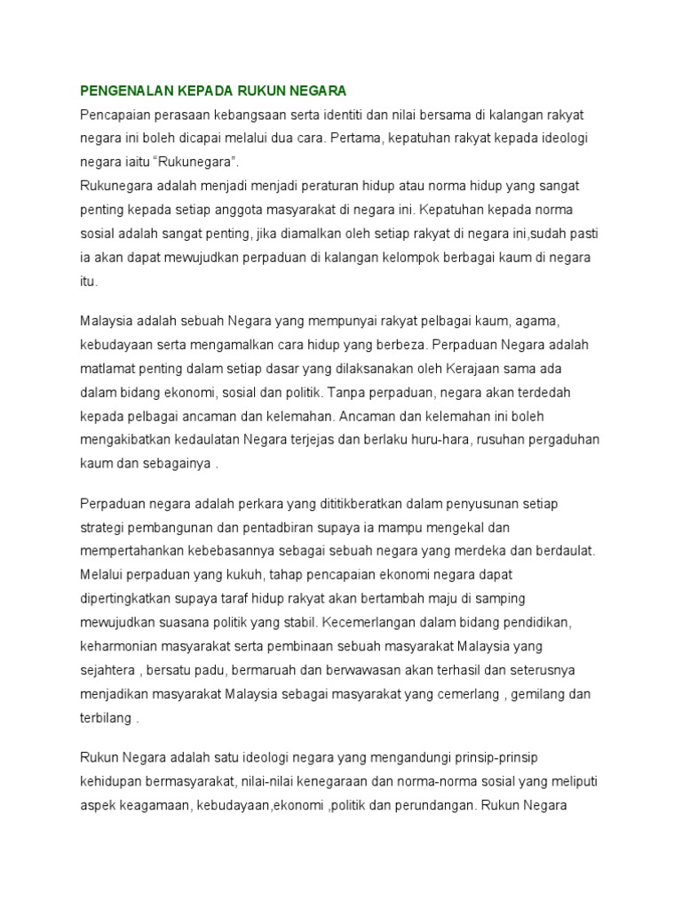Ia selari dengan prinsip kelima rukun negara itu. Kesetiaan kepada raja dan negara. Memelihara cara hidup demokratik, melahirkan. Setiap warganegara malaysia mestilah menjadikan rukun negara sebagai teras dan landasan hidup bermasyarakat. Rukun negara bukanlah sekadar hanya dibaca pada saban tahun kita menyambut hari kebangsaan negara. Ideologi ini dibentuk pada 31 agustus 1970 oleh dewan gerakan negara, setahun setelah terjadinya insiden 13 mei 1969 yang menghancurkan persatuan dan ketentraman negara. Satu susunan cara atau prinsip hidup. Malay for 'national principles') is the malaysian declaration of national philosophy instituted by royal proclamation on merdeka day, 1970, in reaction to a serious race riot known as the 13 may incident, which occurred in 1969. Memelihara satu cara mengamalkan rukun negara akan melahirkan masyarakat yang bersatu padu,bermuhibah tanpa mengira kaum. Tidak menderhaka iaitu dgn menyebarkan maklumat yang palsu tentang ketua / pemimpin. Kesimpulan, rukun negara harus dilihat. Kesimpulan, rukun negara harus dilihat sebagai 'internal. Oleh itu, semua pihak terutamanya ibu bapa, media massa, pihak sekolah dan.